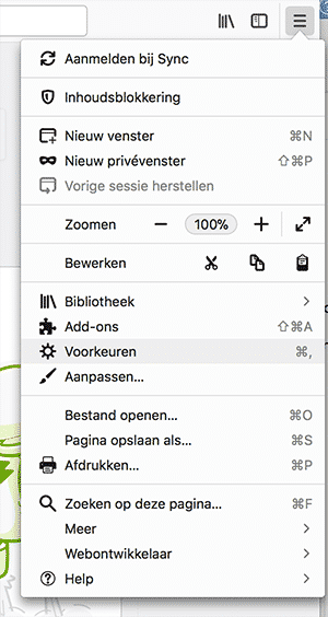 - Klik in de browser in de rechter bovenhoek op de 3 strepen (het menu), vervolgens op Voorkeuren