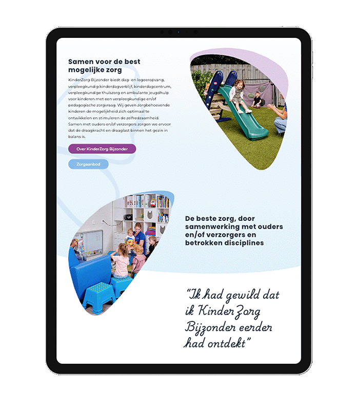 KinderZorg Bijzonder had een website die niet meer aansloot bij wie ze werkelijk zijn. Ouders met zorgbehoevende kinderen vonden niet gemakkelijk de weg naar hun diensten, terwijl er vaak meer mogelijk is dan men denkt. De grootste uitdaging? Drempels weghalen bij ouders die denken “dat zal wel niet voor ons zijn” of “dat moet ik toch zelf kunnen”. Tijd voor een website die warmte uitstraalt, vertrouwen geeft, en duidelijk maakt: ouders staan er niet alleen voor.