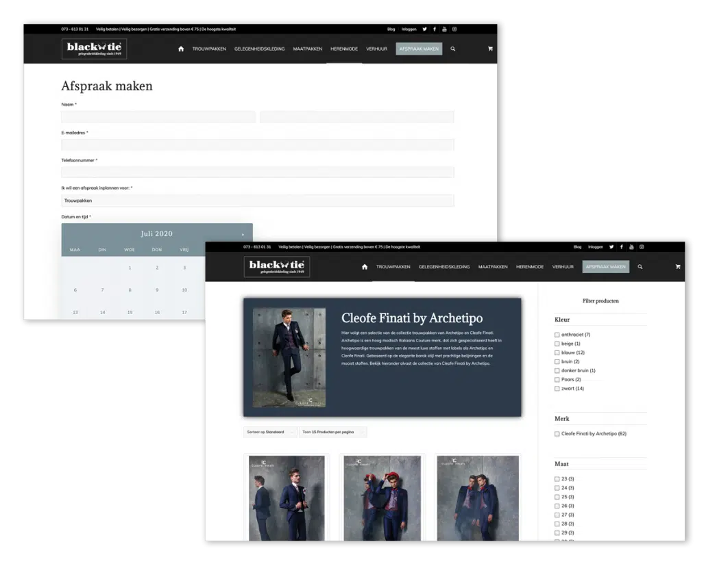 Naast de website heeft Black Tie ook een fysieke winkel. Tijdens de strategie gesprekken is er ook gesproken over hoe de webshop de fysieke winkel kan versterken. Vanuit de website willen we mensen naar de winkel leiden. We hebben alle producten online gezet, ook producten die niet in de webshop te koop zijn. Wanneer de bezoeker op een van die producten klikt, komt hij/zij terecht op de afspraken-pagina om een afspraak te maken in de winkel. Op elke pagina is elk product uitgebreid met meerwaarde van de winkel. Aan de achterkant wordt de klant voorzien van extra informatie over de producten die de websitebezoeker graag wil bekijken gedurende de afspraak, zonder deze eerst zelf te hoeven selecteren.