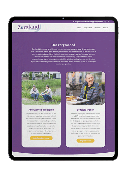 Zorgland Dienstverlening heeft nu een website die aansluit bij de nieuwe koers. Modern, overzichtelijk, toegankelijk. Bezoekers vinden sneller wat ze zoeken, de content vertelt het verhaal van de nieuwe generatie, en technisch zit alles op orde om door te groeien. En op social media? Daar bouwen we structureel aan hun naamsbekendheid, maand na maand, post na post.